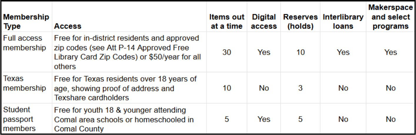 Residents in the Library District boundaries and in the zip codes adjacent to the Library District receive free library cards. The following zip codes can receive a free MFPL library card: 78004, 78006, 78015, 78027, 78070, 78132, 78133, 78163, 78606, 78623