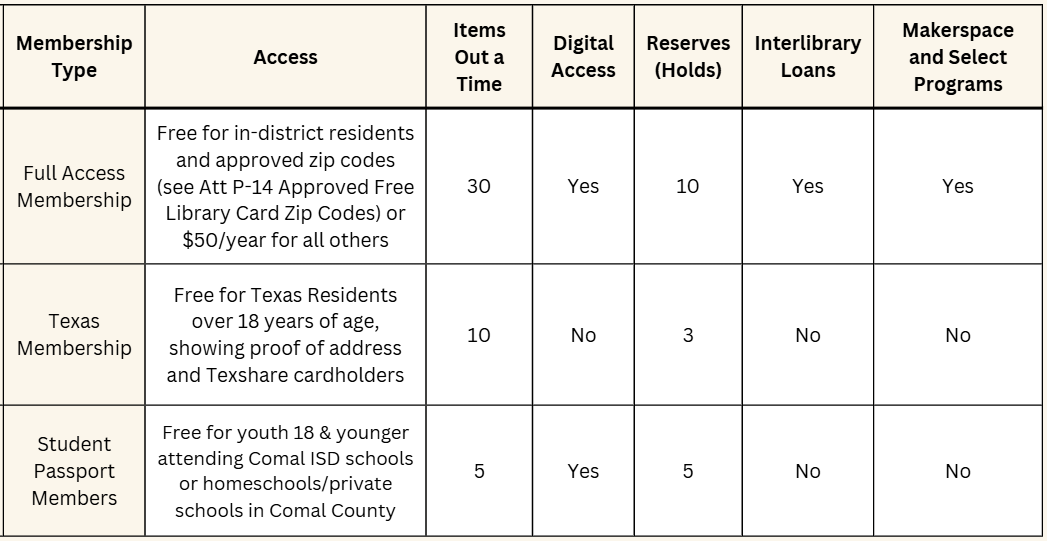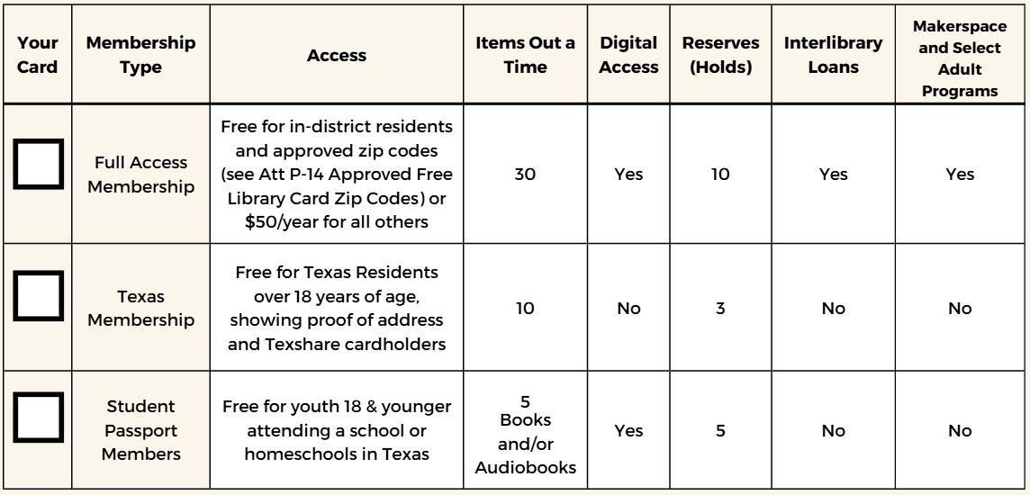 Non-residents outside the approved zip codes may obtain a FREE access library card with limited access with proof of Texas address. To receive a free Texas library card, please provide the following information: